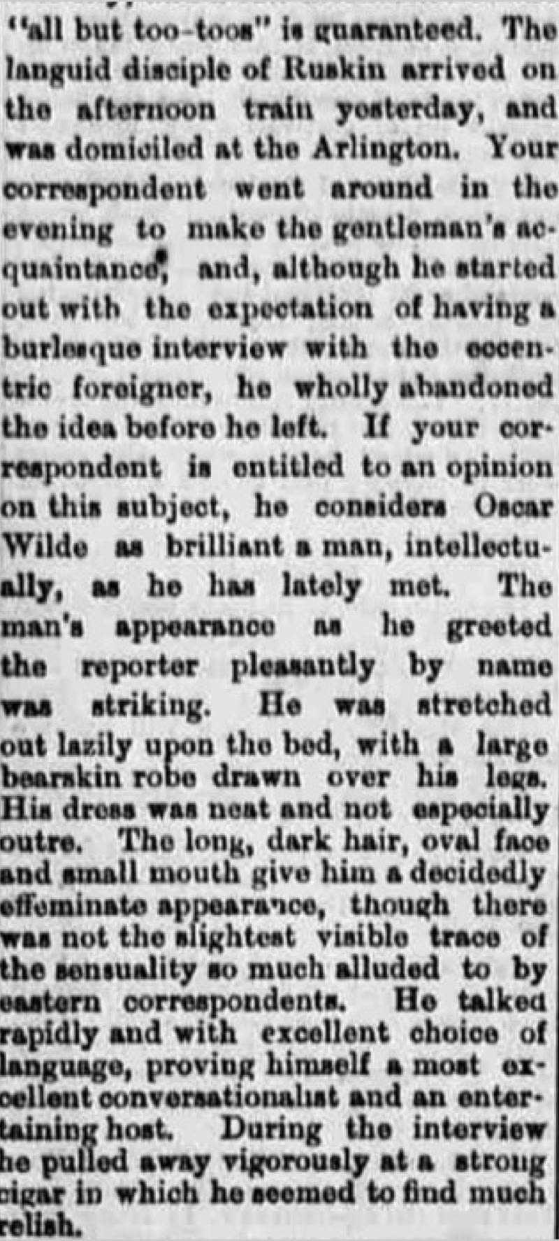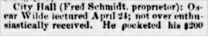 One source of confusion is that the theater where Wilde lectured was known as "City Hall"—with the name used in the sense of a music or concert hall, (e.g. as in Carnegie Hall). The lecture did not take place at a city hall in the usual sense of a municipal building.