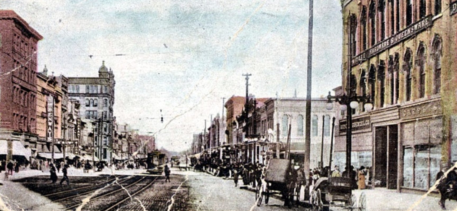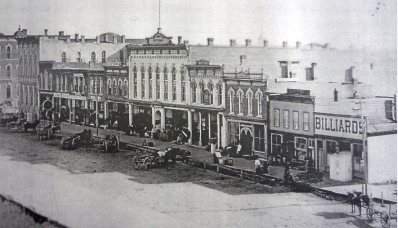 O Street, Lincoln, Nebraska between 9th and 10th Streets c. 1878, with paving and sidewalk under construction.