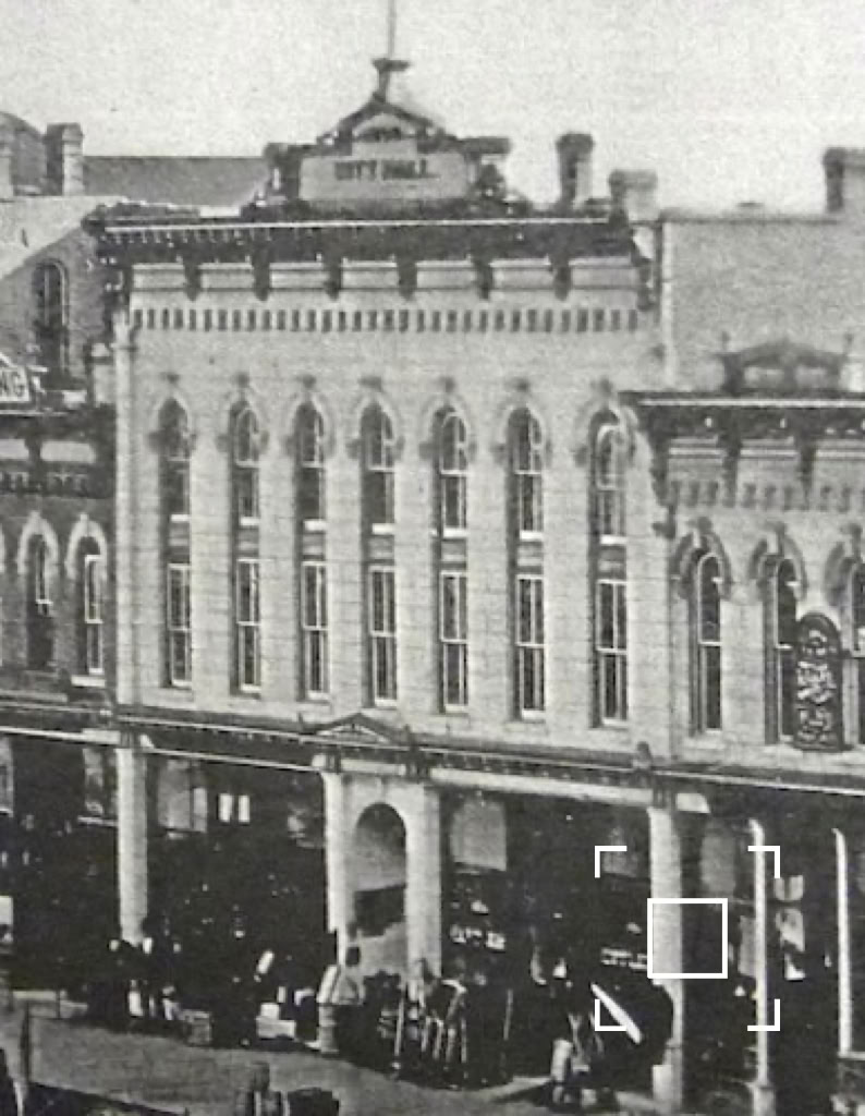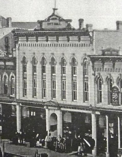 Wilde's lecture venue is the pale colored buildng, center, with the words CITY HALL on the ornament of the north facing cornice.