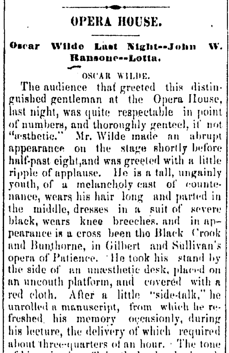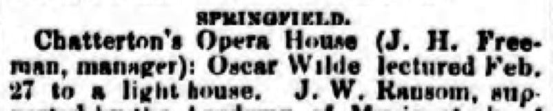 However, according to the Lincoln Library in 1911 citing the Illinois State Register of February 27, 1882 (not found) when reporting to the early Wilde researcher R. B. Glaenzer, Wilde stayed at the Leland Hotel. [1]