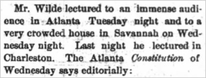 The arrival of the apostle of modern Aestheticism was an event which would have been marked by something of a demonstration, but for the fact that very few people knew at what hour the apostle would reach the city. A few moments after 1 o'clock yesterday an open carriage stopped in front of the ladies' entrance to the Charleston Hotel. From this emerged first a small but good looking American citizen, a little off-color; then a dapper little red whiskered man, and finally two hundred pounds of avoirdupois of aesthetic human flesh and bones done up in a mouse-colored velveteen shooting jacket and salt and pepper small clothes. The head was ornamented with long ambrosial locks of very dark hair, and capped with a broad brim, dim colored slouch hat, something out of the style of Buffalo Bill or Texas Jack. ’That’s him,’ cried Ingliss, the barber, who had come out to see the sight, and there was a rush of the few persons who were loafing about the hotel in the direction of the show, while the store fronts in the immediate vicinity were speedily adorned with idle salesmen and drummers. The door of the ladies' entrance being locked, the 200 pounds of aestheticism posed about on the door steps, grim and dusty, and uncomfortable, but looking all the same like a magnified photograph of Geo. Denham in the role of 'Bunthorne' forcibly to mind ...