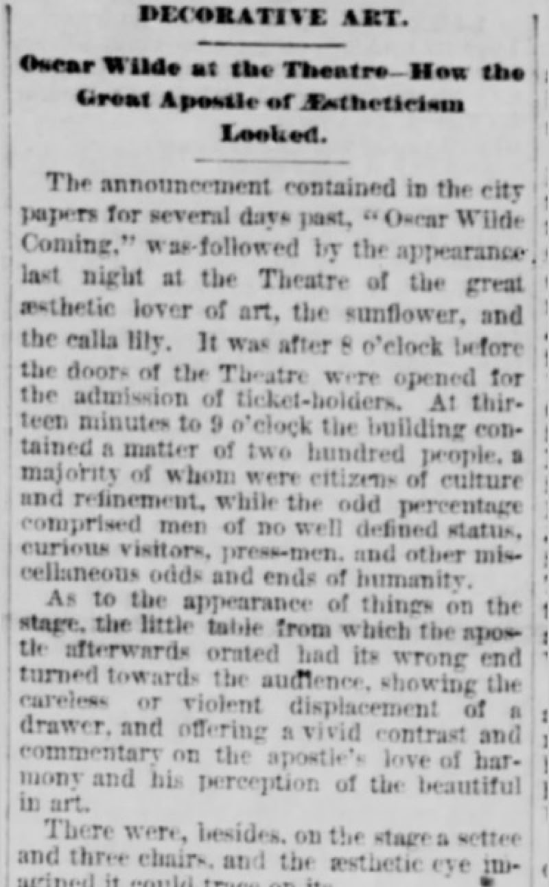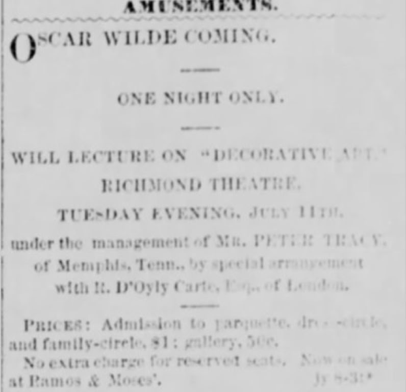After Richmond, Wilde took time off from regular lecturing, and traveled to Newport, RI (via New York) to be guest of Julia Ward Howe.