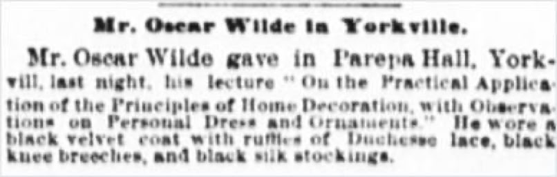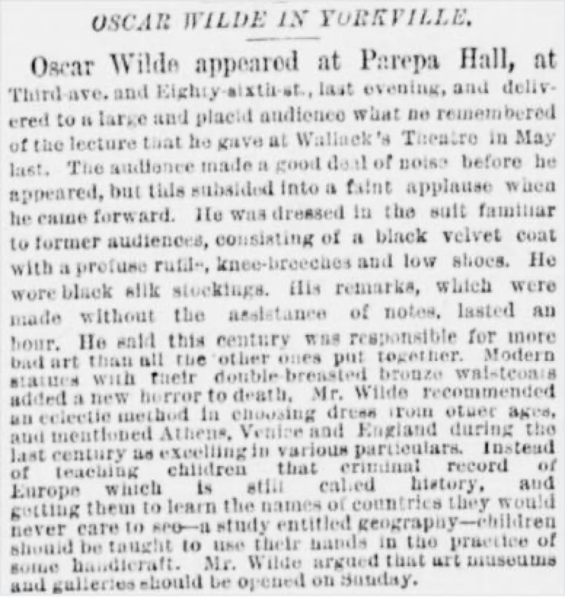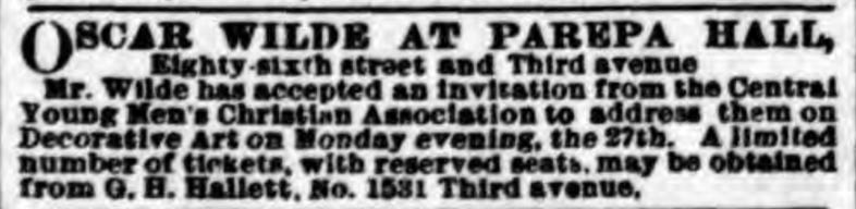 At the time of the lecture Wilde was living in New York City at 48 West 11th Street (building extant).