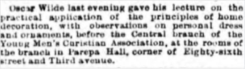 The reported full title of the lecture was: 'The Practical Application of the Principles of Home Decoration With Observations on Personal Dress and Ornaments'.  This designation is similar to the full title of Wilde’s talk for the YMCA in Philadelphia on May 10