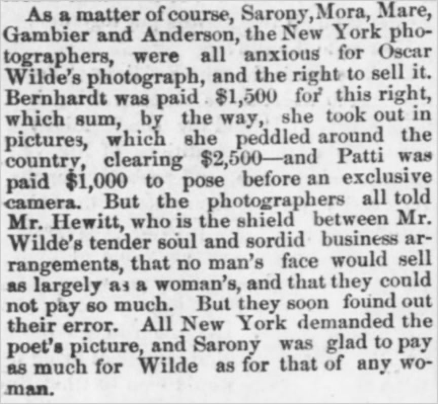 ‍This is a common misconception, probably beginning with Lewis & Smith. Much evidence exists about the nature of Wilde’s remuneration, including Sarony’s own acknowledgment in interview, and his testimony in court (in connection with his Copyright Infringement Case) attesting to the fact that Wilde was paid, probably a lump-sum plus payment in kind via the sale of photographs.